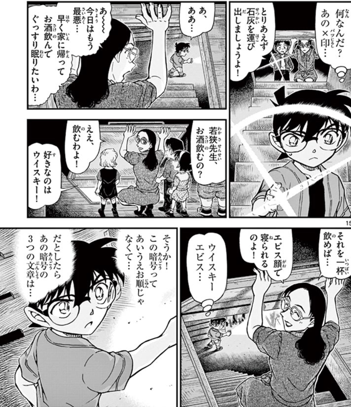 つまり、若狭先生はコナン君より先に暗号を解読し、そのヒントをわざわざ遠回しに教えているわけです。
