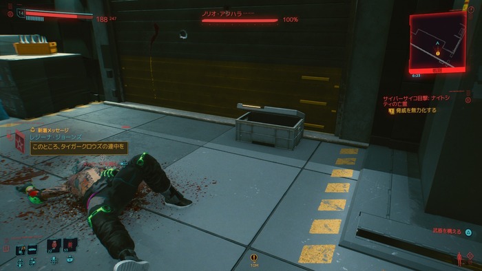| ② | すぐ右隣にある「!」に向かうと、サイバーサイコのサイドジョブが発生。そのまままビルの奥へ進む。 |