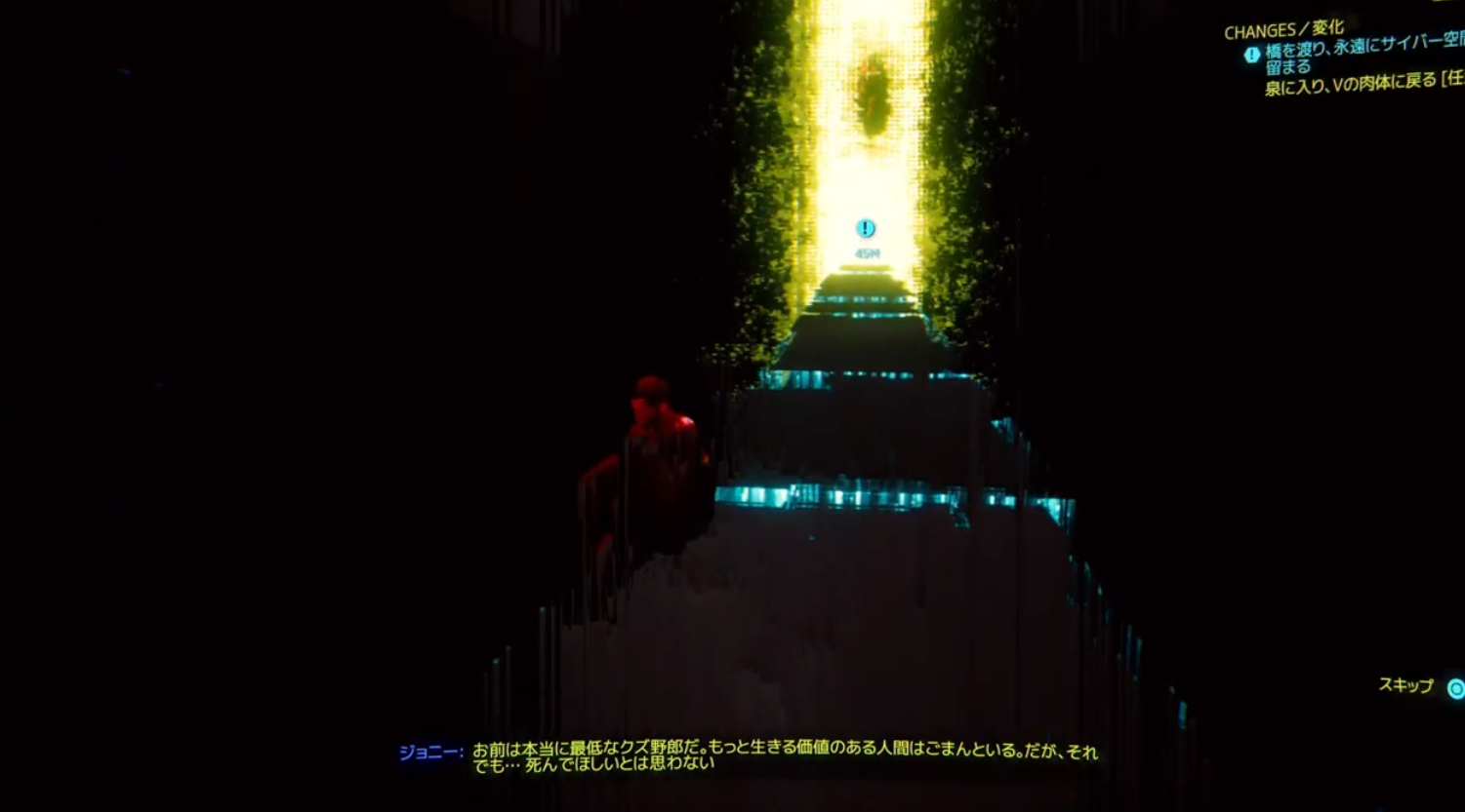最後は他のエンディングと同じように、Vが世界に戻る選択肢とそうでないかでルートが分かれます(↑参照)