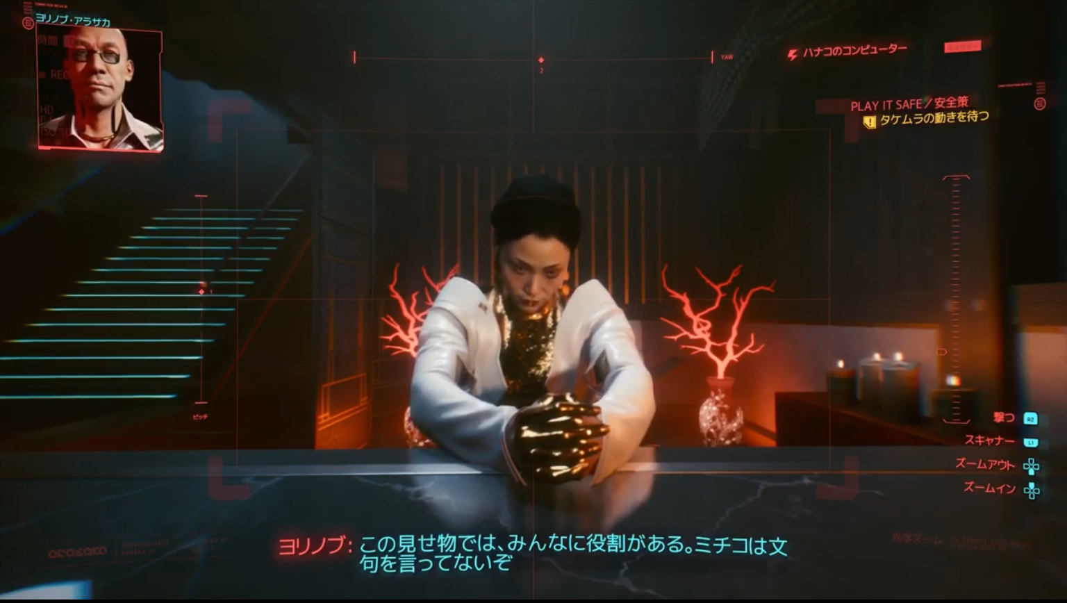 ・vはサブロウの死の証人であり、タケムラと一緒にヨリノブの悪事を白日にさらす必要がある→アラサカのナンバー2ハナコに会いに行く。