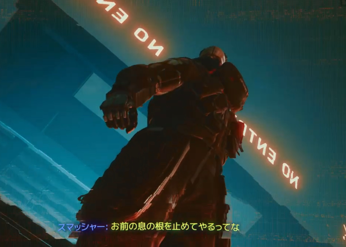 しかし、逃げる寸前でジョニーは、ナイトシティの伝説である「アダム・スマッシャー」によってとらえられてしまいます。。。