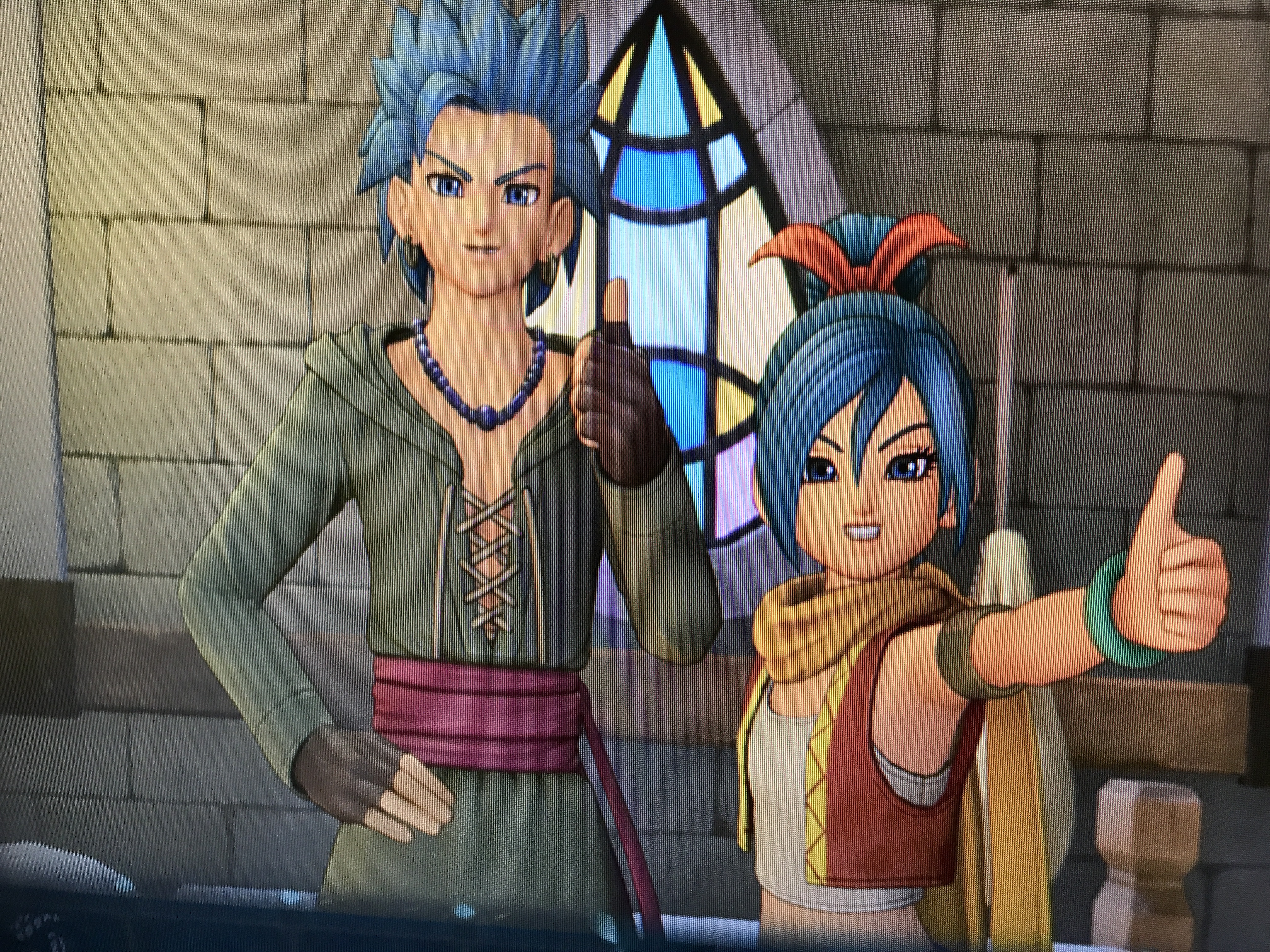 今はなぜかモヒカンがなくなり、ペンダントもなく、格好も勇者っぽくなっています。