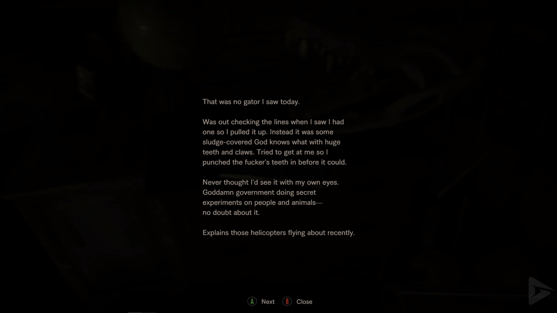 「川の様子を見に行ったら、ものすごい牙と爪をもった頭のおかしなヤロウが俺を襲ってきやがった!信じられなかったぜ。きっと政府が何か秘密の実験をして、人間や動物をあんな姿にしやがったんだ。見ろ、その証拠に外には武装ヘリがうようよ飛んでやがる」