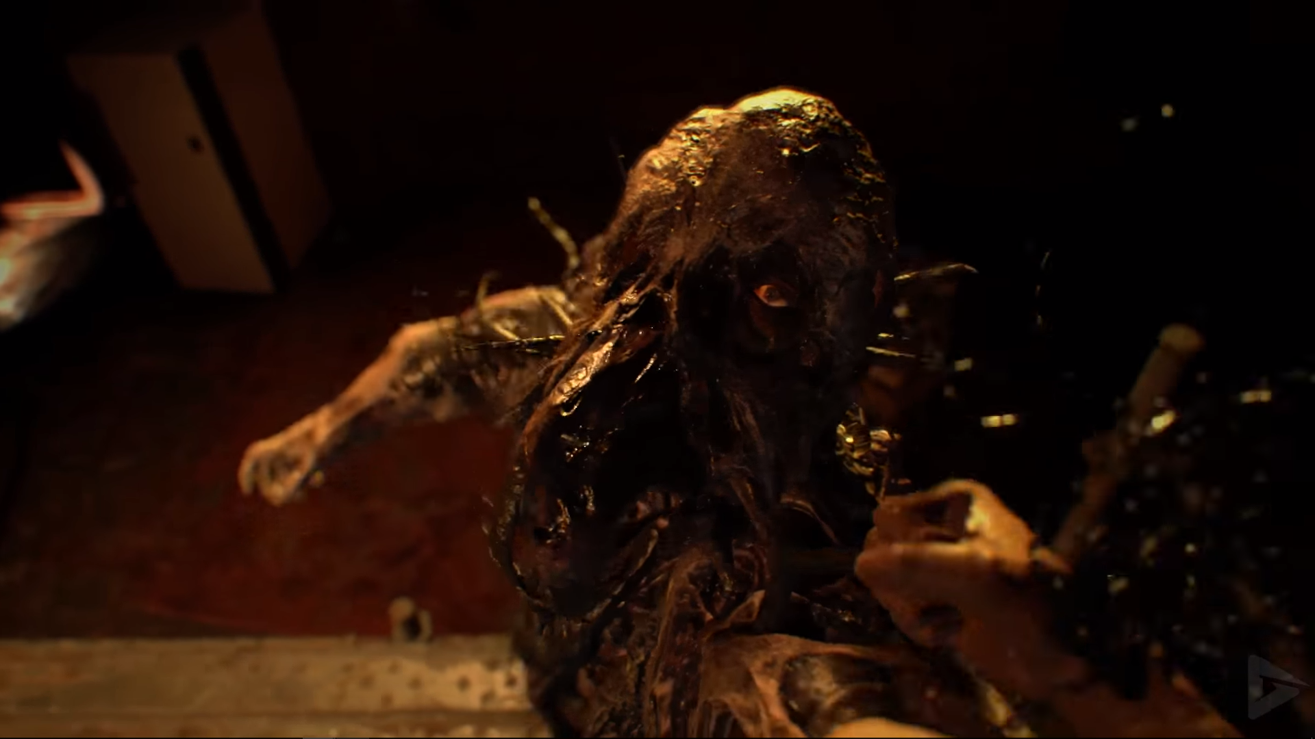 おそらく、この瞬間にバイオ7本編で主人公イーサンがエブリンを倒し、彼女の完全な石灰化を止めたのでしょう。