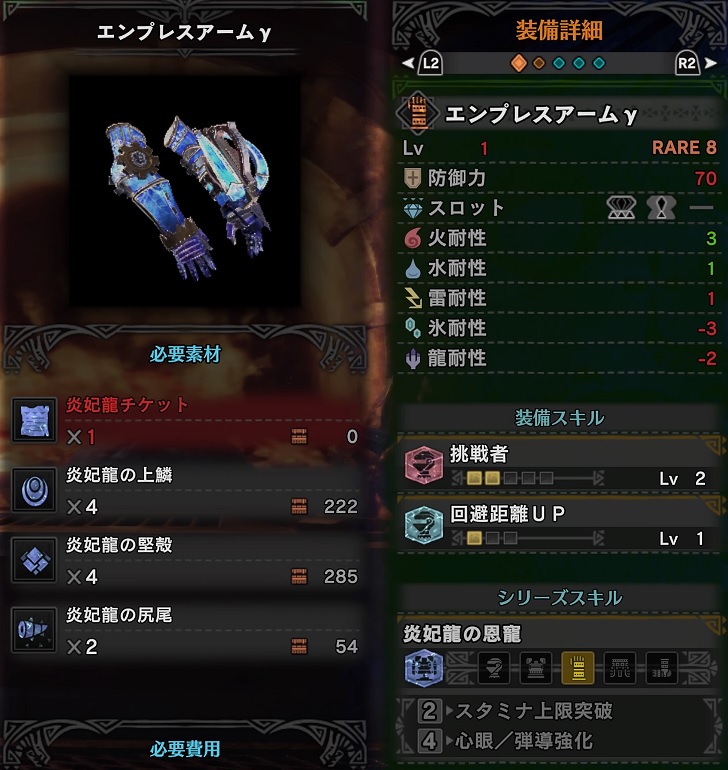| 腕 | 炎妃龍の尻尾×2 炎妃龍の堅殻×4 炎妃龍の上鱗×4 炎妃龍チケット×1 |