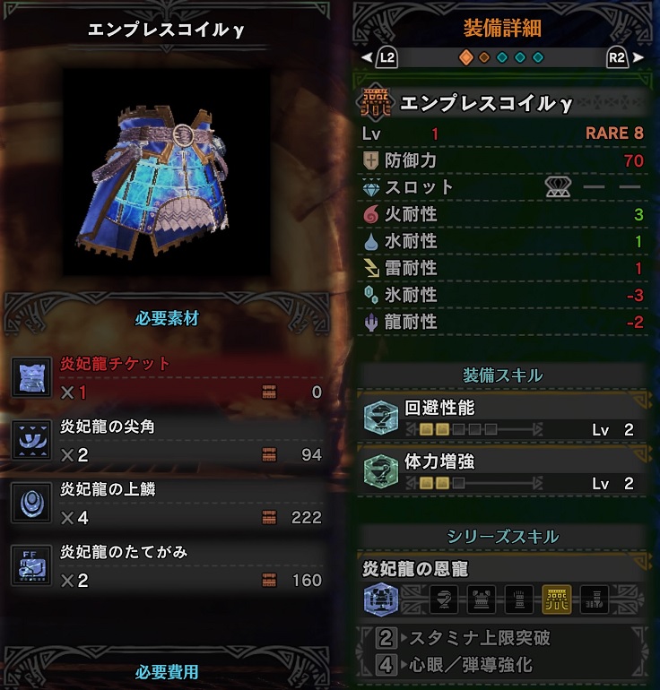 | 腰 | 炎妃龍のたてがみ×2 炎妃龍の尖角×2 炎妃龍の上鱗×4 炎妃龍チケット×1 |