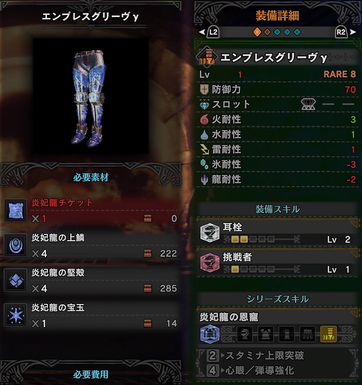 | 脚 | 炎妃龍の宝玉×1 炎妃龍の堅殻×4 炎妃龍の上鱗×4 炎妃龍チケット×1 |