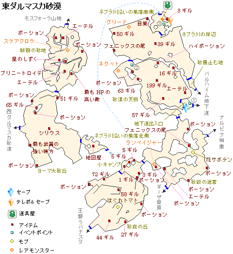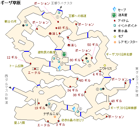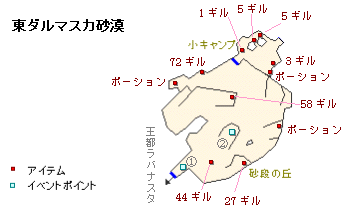 | 8 | 地図屋で地図を購入可能。 東ダルマスカ砂漠の地図 50ギル 西ダルマスカ砂漠の地図 550 ギル ギーザ草原の地図 50ギル | 王都ラバナスタの地図、東ダルマスカ砂漠の地図、ギーザ草原の地図 |