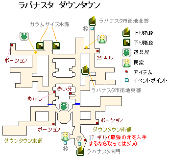 | 5 | ダウンタウンスタート地点。 | トレジャーの中身は17ギル、25ギル、赤い牙、ポーション、ポーション |