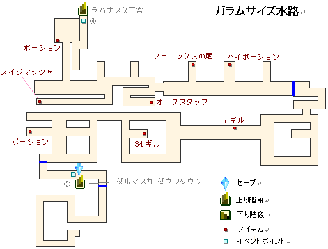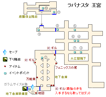 | 1 | スタート地点。 ガラムサイズ水路から上がってくるとここにでます。 セーブポイントがあるので、セーブしておきましょう。 すぐ近くに地図があるので入手します。 | 地図、万能薬、90ギル、90ギル、90ギル、フェニックスの尾