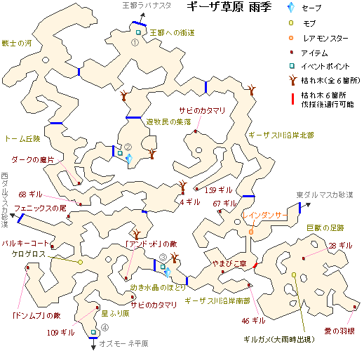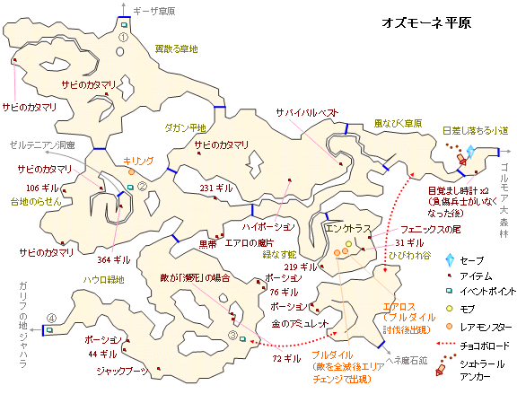 | 1 | オズモーネ平原のスタート地点です。 オズモーネ平原に出たら、南→南→南西と進んでいきます。 オズモーネ平原のマップは、目的のガリフの地で売っていますので、探索はマップ購入後を推奨します。 | サビのカタマリ、サビのカタマリ |