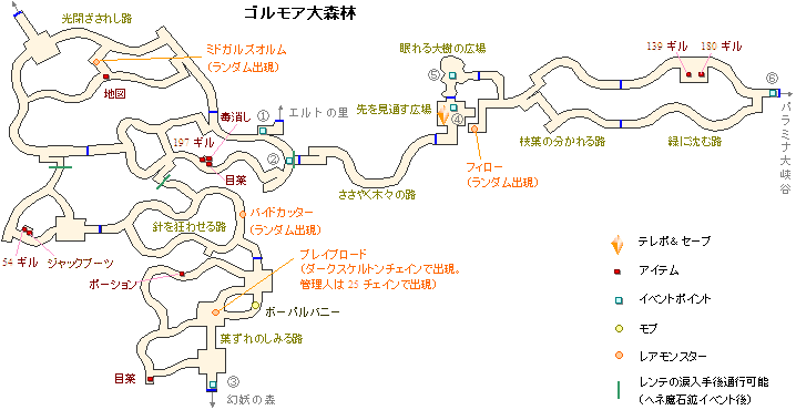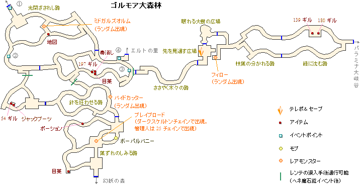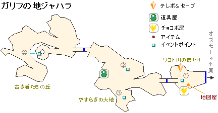 | 3 | この位置にチョコボロードがあります。 (今はまだ使いません) | ポーション、76ギル、ポーション、44ギル、ジャックブーツ |