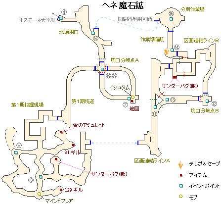 | 7 | 抗口分岐点Aでスイッチを押して、南(直進)の第1期坑道へ。ここで地図を入手しておきましょう。 | 地図 |