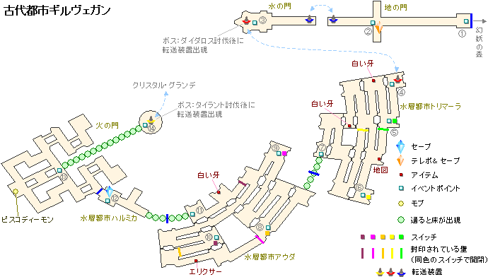 | 4 | 古代都市ギルヴェガン内部のスタート地点です。 転移装置で水層都市トリマーラへ進みます。 | |