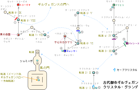 | 3 | 現を惑わす路を南に進み、古の終わる処へ着くとセーブクリスタルがあります。 | |