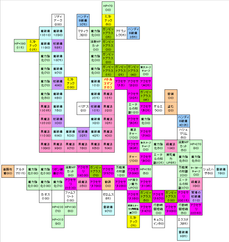 | HP+ | 力強化 | 魔力強化 | 魔力UP | 消費MPカット | エーテル知識 | 万能薬知識 | 行動短縮 |