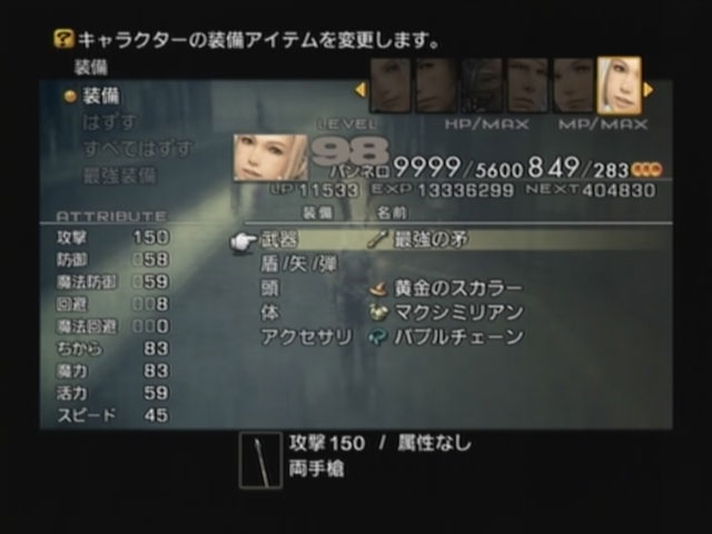 次にバトルメンバーを1人にして武器と盾を外します。