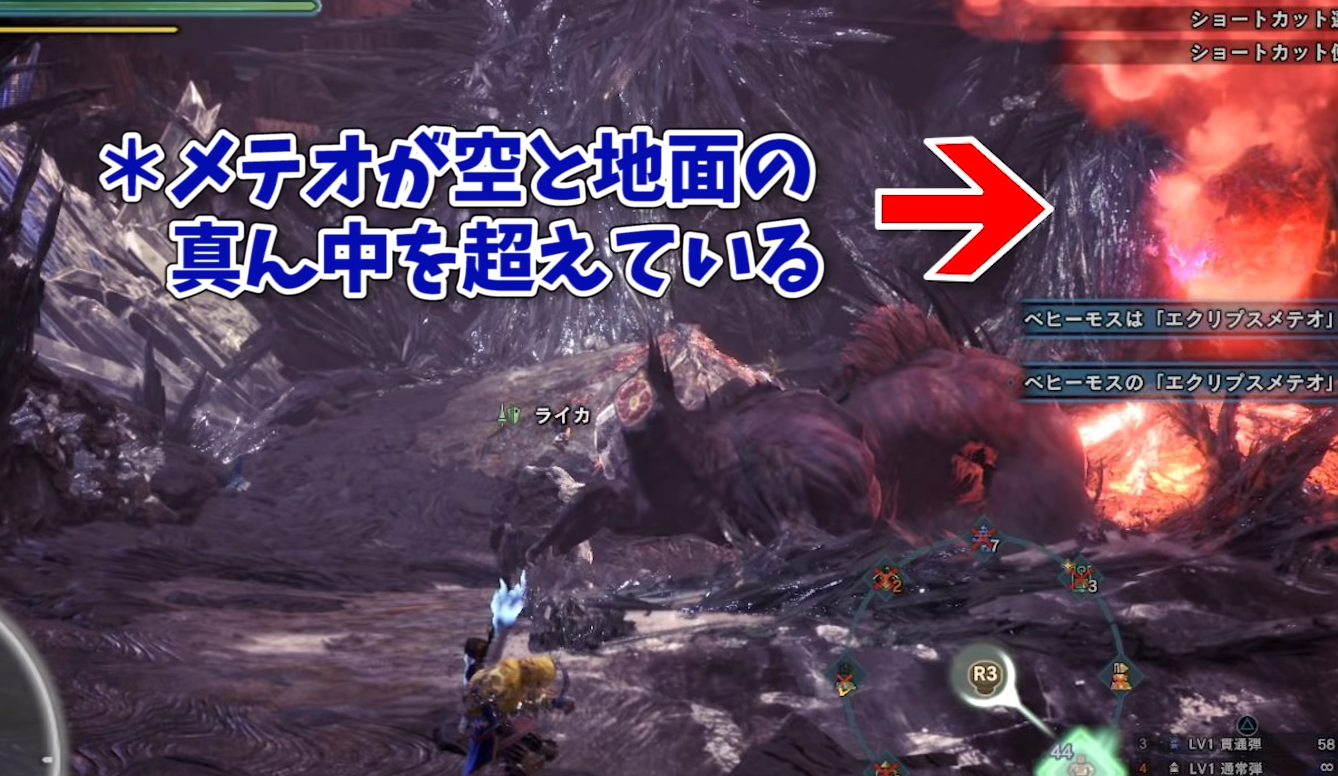 こちらはエクリプスメテオがまだ空中から出てきた瞬間にジャンプしたために失敗。