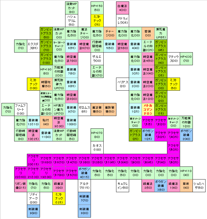 | HP+ | 力強化 | 魔力強化 | 魔力UP | 消費MPカット | エーテル知識 | 万能薬知識 | 行動短縮 |