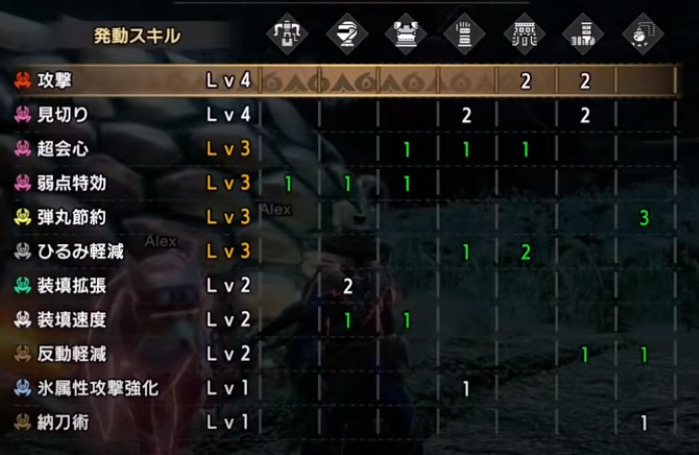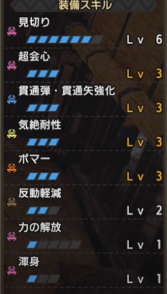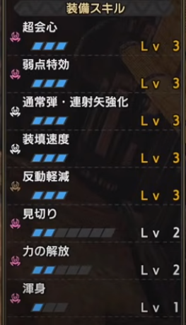 攻撃Lv2、貫通弾・貫通矢強化Lv3、見切りLv4、超会心Lv2、反動軽減Lv2、気絶耐性Lv1、通常弾・連射矢強化Lv1、力の解放Lv1、他スロット①のスキル×3