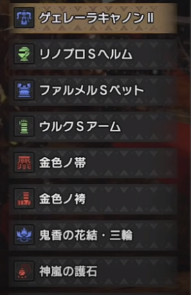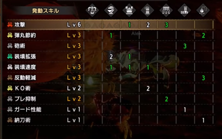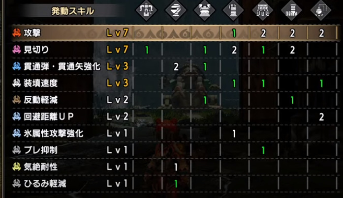 攻撃Lv5、弾導強化Lv3、散弾・拡散矢強化Lv3、反動軽減Lv3、回避距離アップLv3、回避性能Lv2、気絶耐性Lv2、装填速度Lv1、滑走強化Lv1、ひるみ軽減Lv1