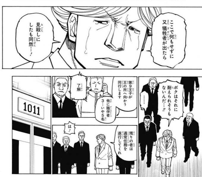 現状、クラピカの守るワブル王子、センリツの守るカチョウと姉妹のフウゲツ、ビスケが守るマラヤームの4王子たちは、この戦場からの離脱を考えており、