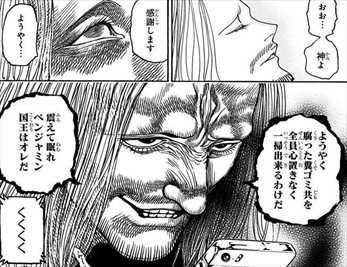 402話では、ハルケンブルクの能力を脅威に思ったベンジャミンが、バルサミコをハルケンブルクの元に送り込んで毒を仕込もうとしています。