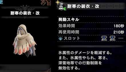 イヴェルカーナは氷属性攻撃メインなうえ、氷属性やられの攻撃をしてくるので、耐寒の装衣があると楽です。
