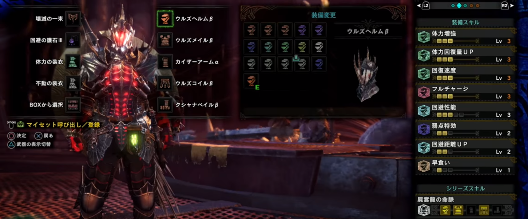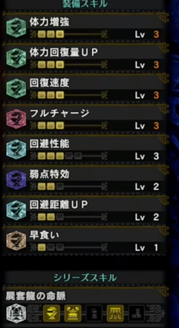 体力増強に体力回復量アップ、回復速度アップ、早食い、フルチャージ、回避性能、回避距離アップと、まさに回避と回復に特化した装備になっています。