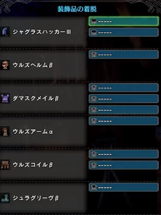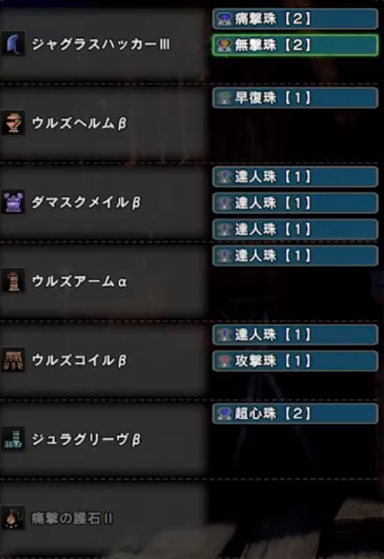 護石や珠をアレンジすることで、さらに防御特化にできたり、火力特化に変えたりもできますし、ウルズ装備を3つ入れればいいので、以下のような組み合わせも可能です。