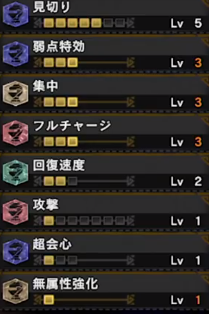 発動スキル:ガード性能Lv5 、精霊の加護Lv1、 瘴気耐性Lv2、 弱点特効Lv3 、フルチャージLv3、 匠Lv3、 砲弾装填数UPLv1 、砲術Lv3、 超回復力