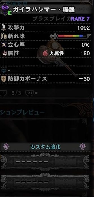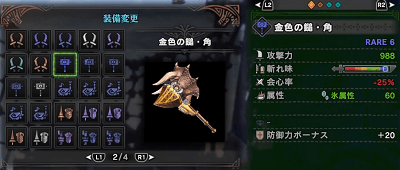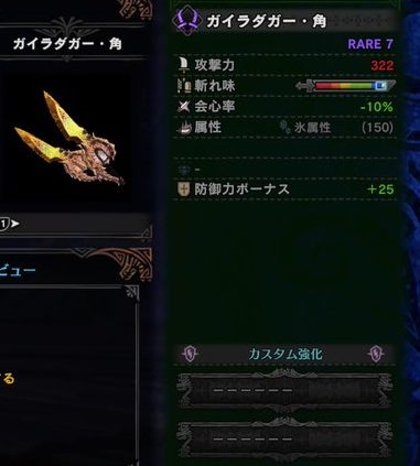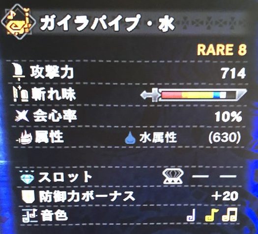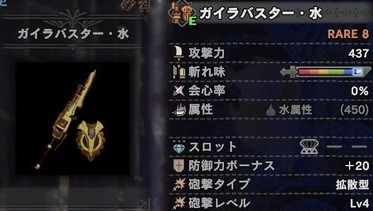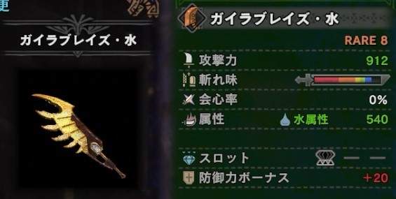 ガイラブレイズ水 912、会心0、水属性540、スロット③、防御力ボーナス20。