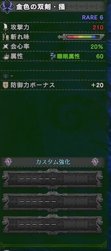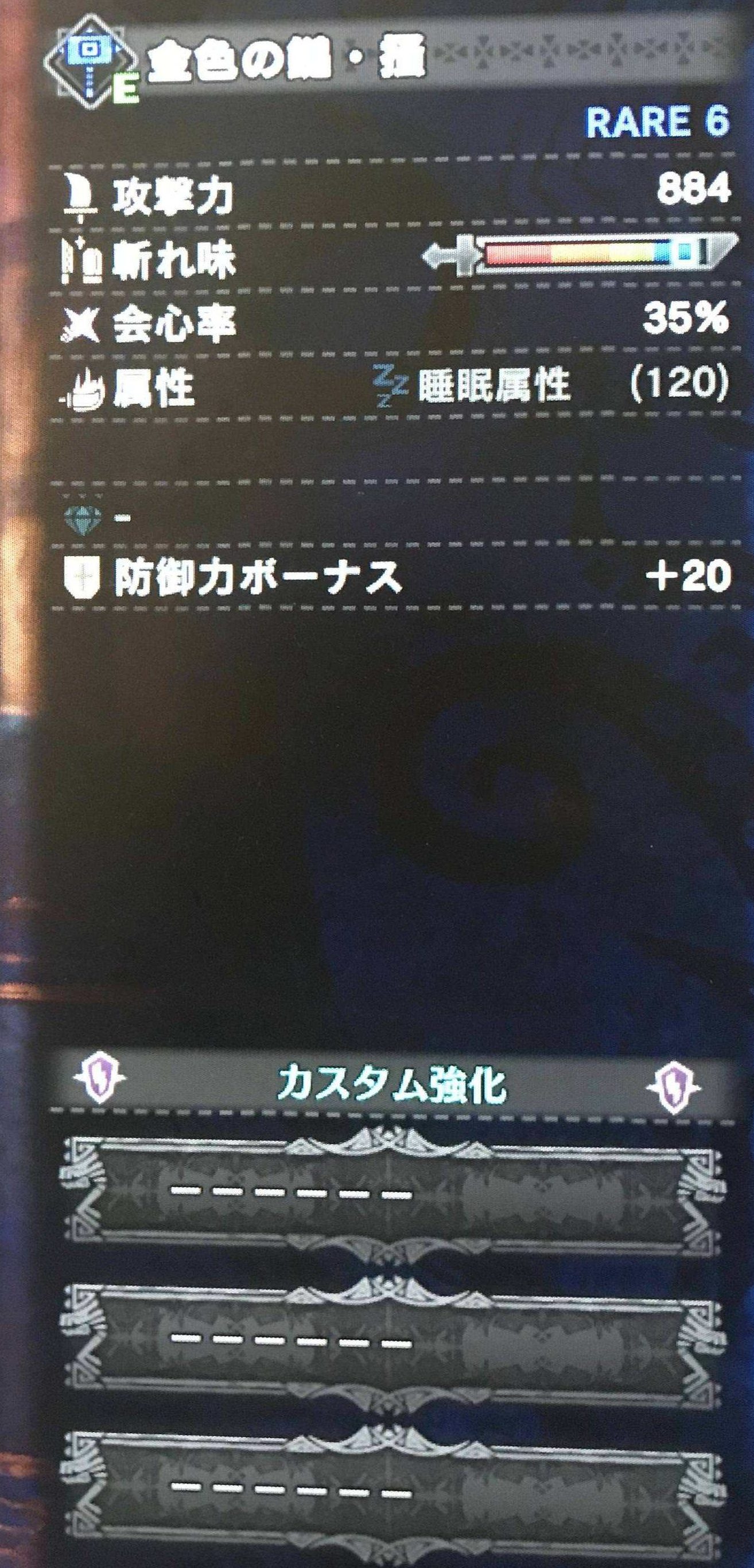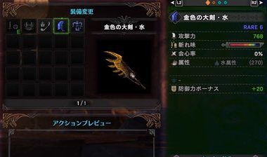 金色の大剣水。攻撃力768、斬れ味青ゲ、会心0、(属性解放)、防御力ボーナス20。スロットなし。