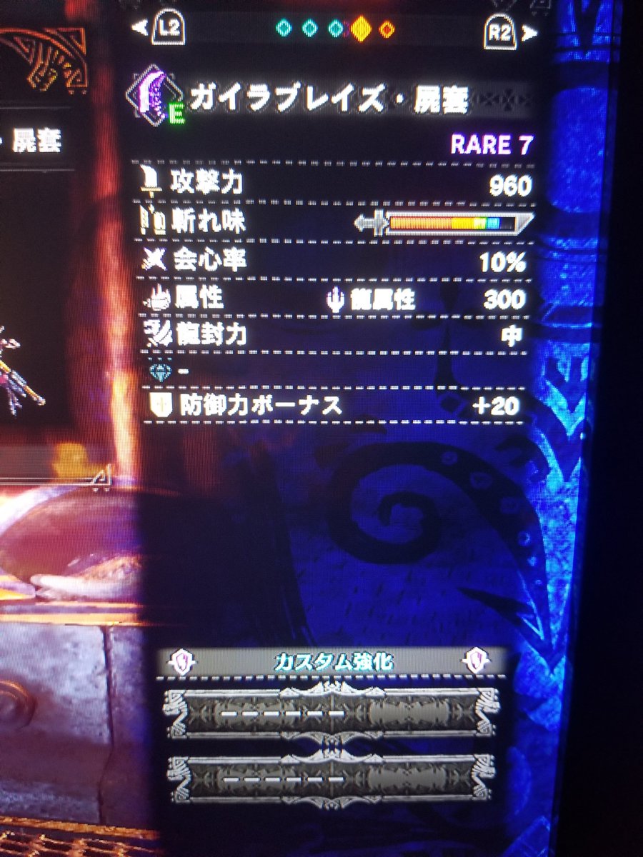 攻撃力960、会心10、龍属性300、龍封力中、防御力ボーナス20。