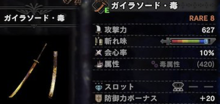 攻撃力627、会心10%、属性解放(420)、防御力ボーナス20、スロット③
