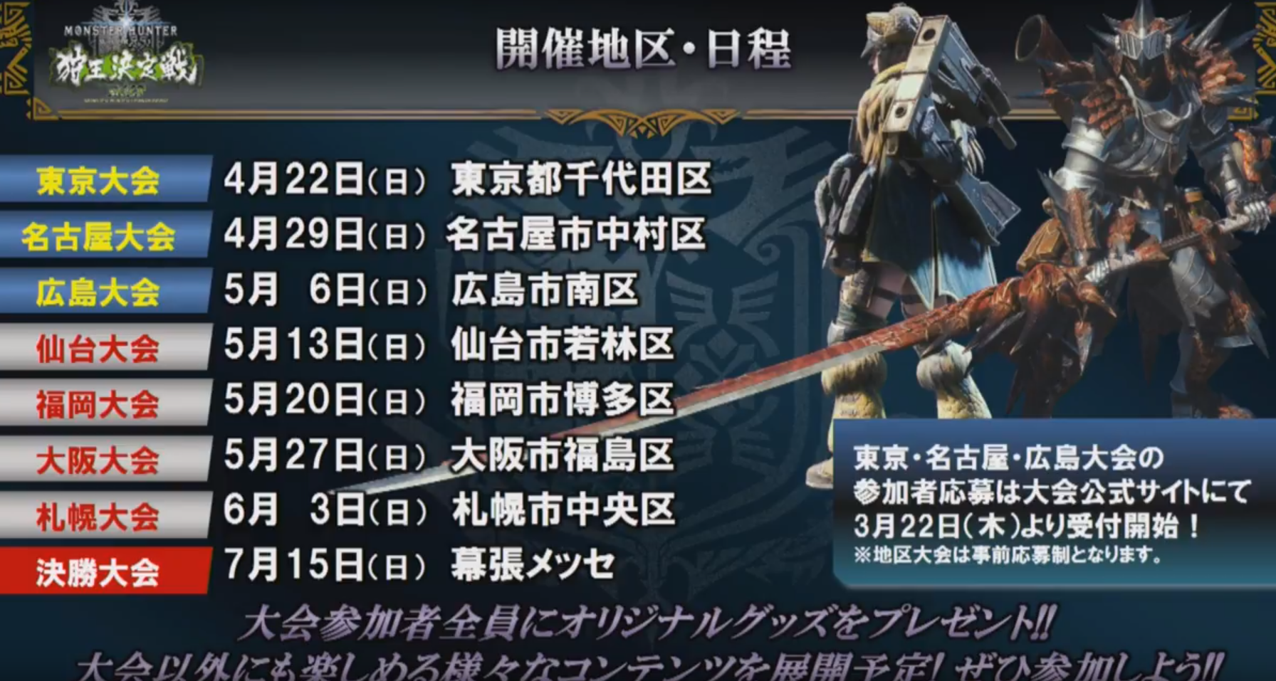 モンハンワールドの全国大会も開催されます!その名も「狩王決定戦」!腕に自信がある方はもちろん、参加だけでもグッズがもらえたりうれしい大会ですので、ぜひ♪私も友達と応募したいと思います☆