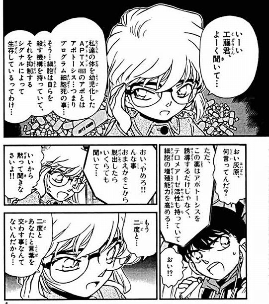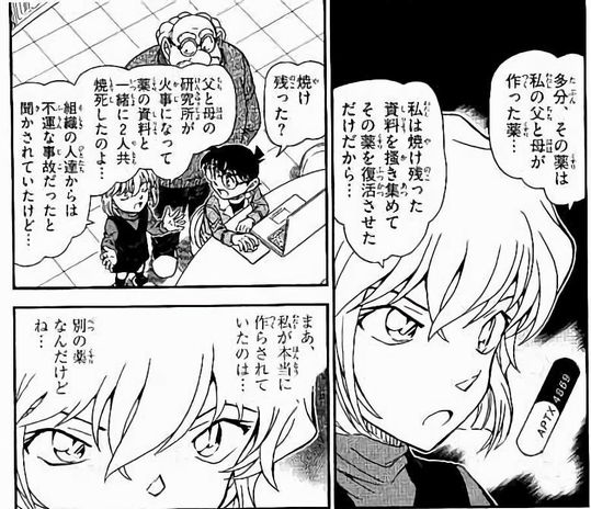 ・灰原哀が研究していたのは、それとはまったく別の薬であり、APTX4869からさらに発展させたもの。曰く「死者を蘇らせる秘薬」。ただし、彼女の研究目的は別にある。