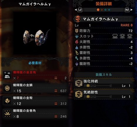 | マムガイラヘルムγ | 気絶耐性+1 強化持続+1 | ③①① |