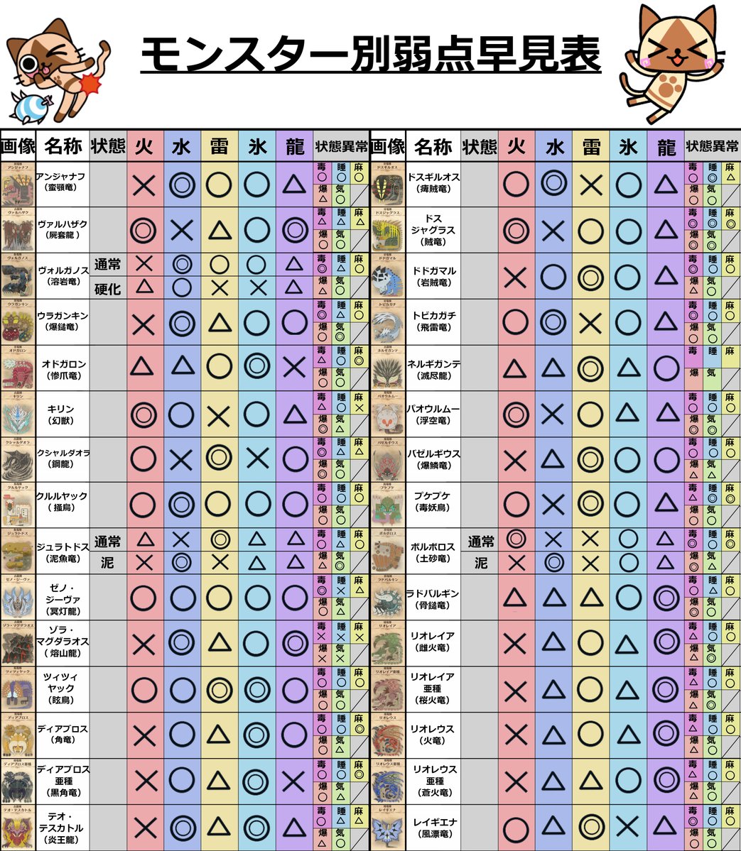 まずこちらは私も参考にさせていただいた弱点属性だけの早見表になっています。