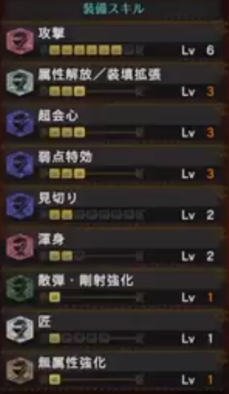 Taroth Arrow “Water”(ガイラアロー水) – Affinity(会心) – Spread(剛射強化)Rath Soul B(リオソウルβ) – Streamx2(水攻撃)