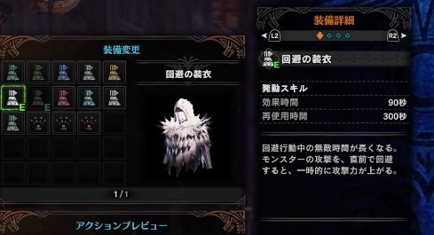 モンスターの攻撃を、直前で回避すると、一時的に攻撃力が上がるという、うまく使えばある意味チートっぽい装備になっています。