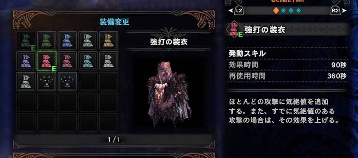 強打の装衣は、「ほとんどの攻撃に気絶値」を追加する、というもの。