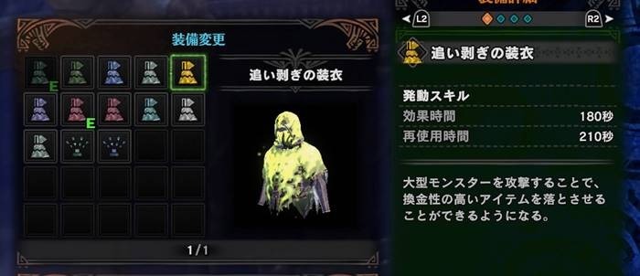 HR10以降に武具屋と会話すると発生※追い剥ぎの装衣の入手方法についてストーリー任務クエスト「ディアブロス狩猟」のクリアが必要と攻略本(電撃)には記載。