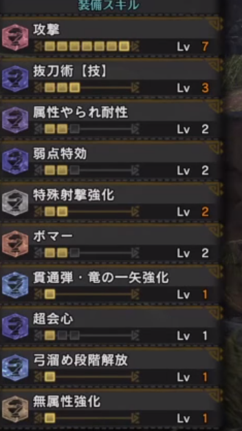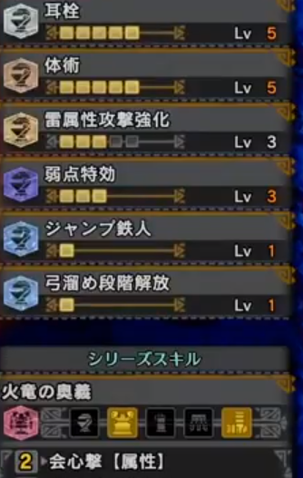 水は解放だから無理だけど、他の属性は会心撃、体術3、弱点特効3、体力3、気絶3、溜め強化、通常矢強化、剛射強化、属性強化2or3ぷらすおまけの超会心あたりで組めるからこれ安定してていいと思うけどな