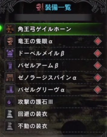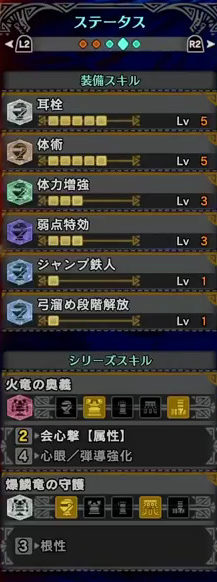 要は、バレカバレ装備はスロットが優秀で、属性会心(会心撃【属性】)、ジャンプ鉄人がついている、あとは体術や耳栓を積んだ属性弓のための快適装備、という感じです。