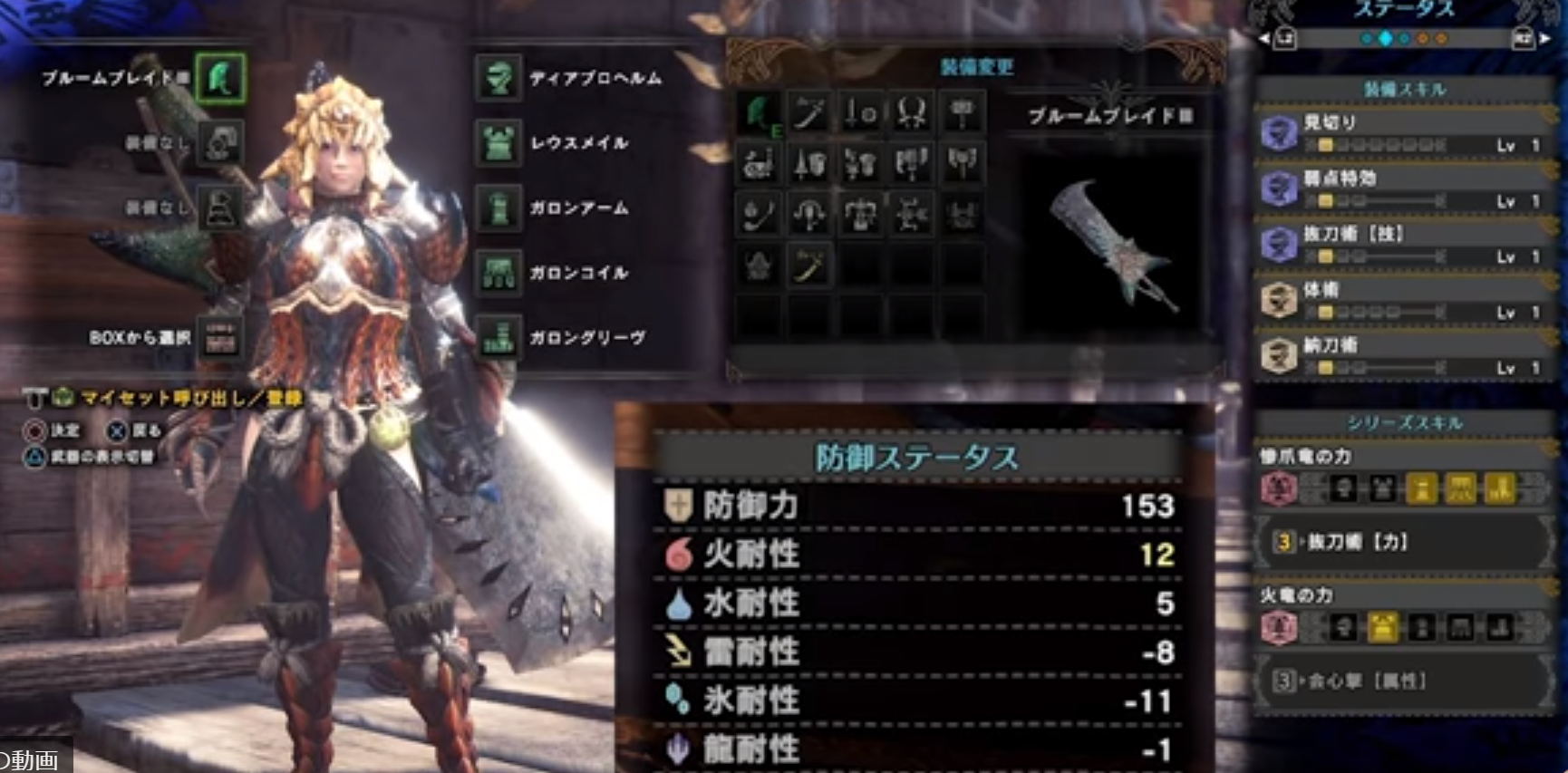 この動画は序盤装備で、スキルを考慮したおすすめ装備になっています。特に序盤ではかなり強いと思いますので引用させていただきます。基本はオドガロン装備です。頭はディアブロス防具。