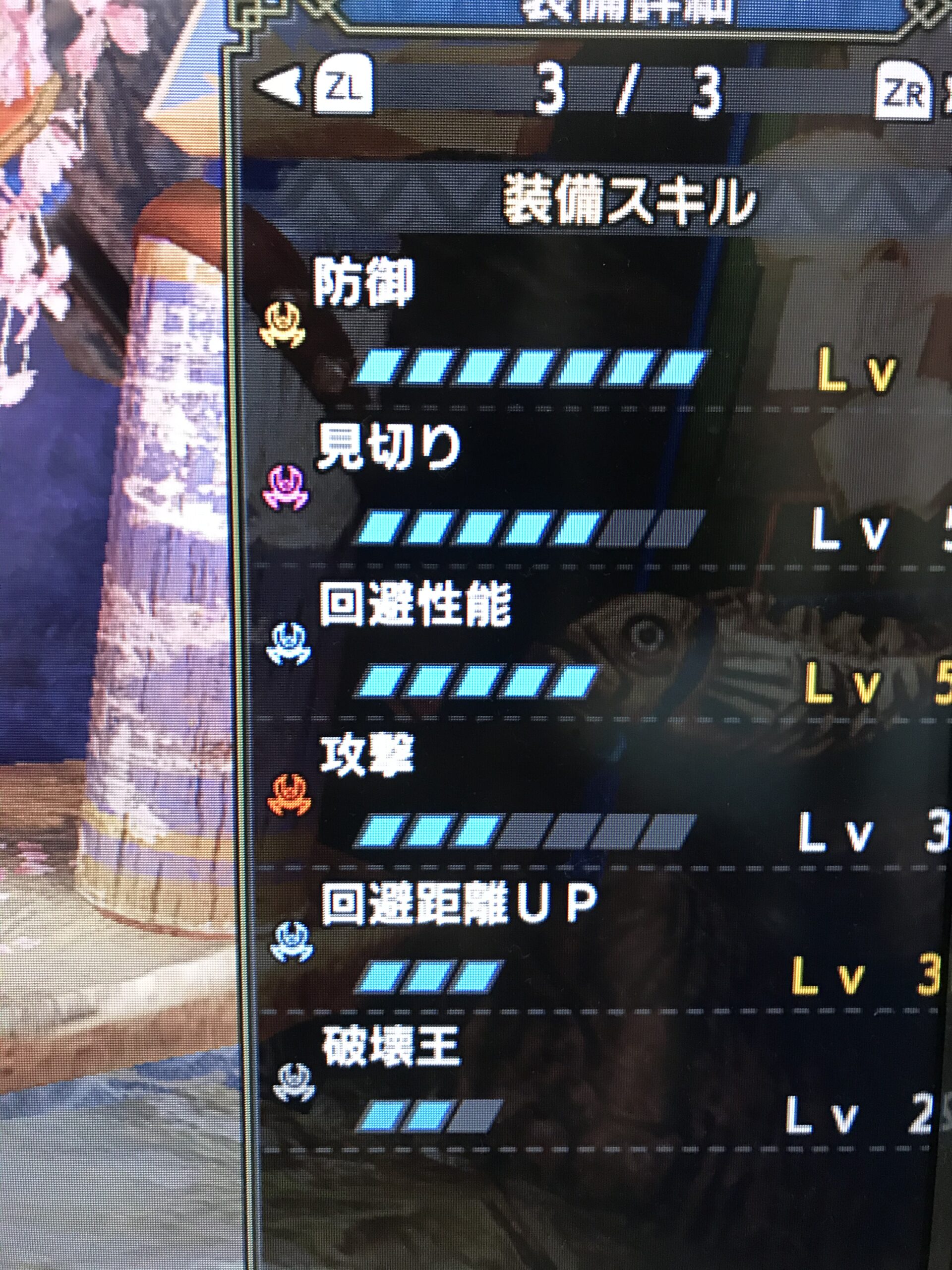 攻撃Lv4 、超会心Lv3、弱点特効Lv3、力の解放Lv3、防御Lv2 、渾身Lv1
