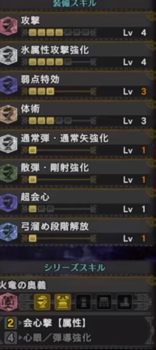 ナナの弱点属性が氷なので、氷属性攻撃強化をつけて剛射で狙うんですね!