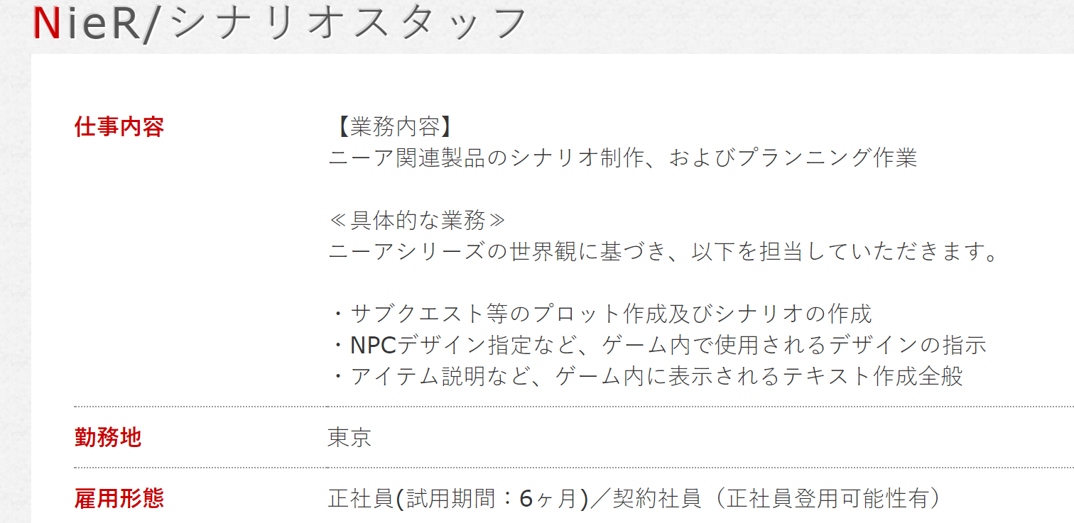 哲学的&結構悲しいテーマが多いニーアシリーズのシナリオ作成ということでかなり大きな仕事ですが、ご興味のある方は、ぜひ応募されてみてください!