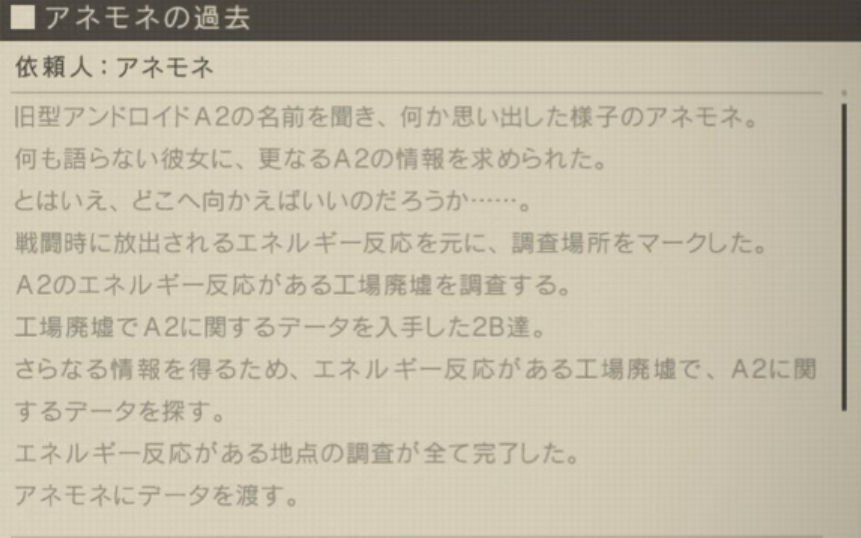 そのデータを渡すと、アネモネが過去、A2と一緒に戦ったことを話してくれます。
